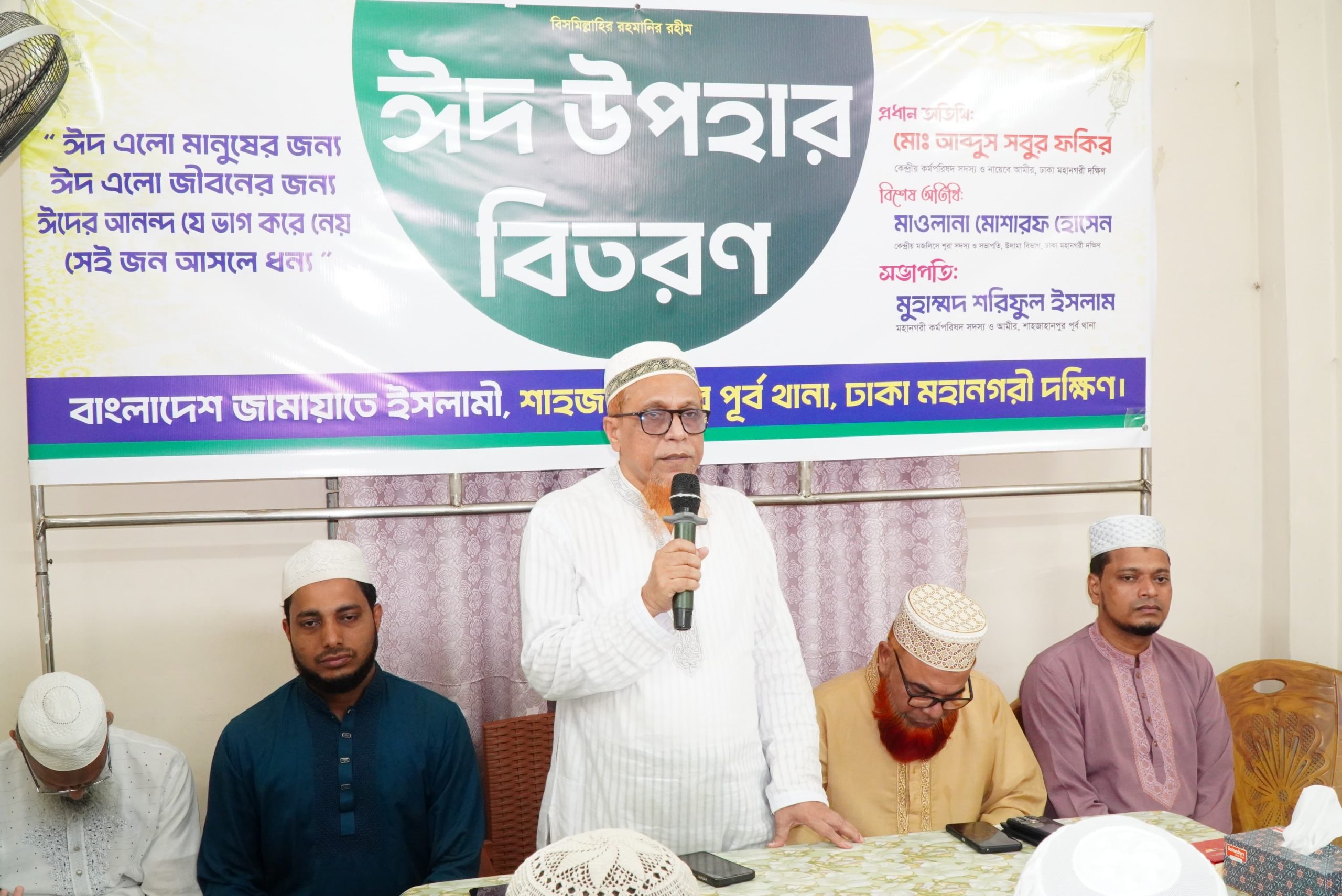 সোমবার (১৬ মার্চ) দুপুরে বাংলাদেশ জামায়াতে ইসলামী শাহজাহানপুর পূর্ব থানার উদ্যোগে অসহায়-দরিদ্রদের মাঝে ঈদ সামগ্রী বিতরণী অনুষ্ঠানে প্রধান অতিথির বক্তব্যে তিনি এসব কথা বলেন। এসময় তিনি আরও বলেন, স্বাধীনতার ৫৫ বছর পরও কেন মানুষকে ছিন্নমূলবাসী বস্তিতে, রাস্তার ধারে ফুটপাতে থাকতে হচ্ছে?- কারণ সৎ ও দুর্নীতিমুক্ত নেতৃত্বের অভাব। মানুষের তৈরি আইনে রাষ্ট্র পরিচালিত হলে কেবলমাত্র ক্ষমতাসীনরা সুবিধা লাভ করে। জনগণ উপকৃত হয় না বরং শোষণের শিকার হয়। শোষণের হাত থেকে মুক্তির জন্য ইসলামী কল্যাণ রাষ্ট্র প্রতিষ্ঠার বিকল্প নেই। ইসলামী কল্যাণ রাষ্ট্র প্রতিষ্ঠা হলে সমাজে কোনো বৈষম্য থাকবে না। প্রতিটি মানুষ রাষ্ট্রের নাগরিক হিসেবে সমান সুযোগ-সুবিধা ও অধিকার লাভ করবে। ইসলামী কল্যাণ রাষ্ট্র প্রতিষ্ঠায় জামায়াতে ইসলামীর নেতৃত্বে এগিয়ে আসতে তিনি আহ্বান জানান।